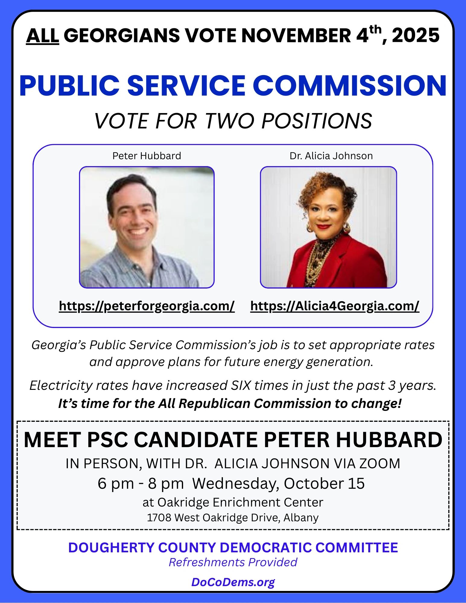 Meet Public Service Commission Democratic Candidates Peter Hubbard, and Dr. Alica Johnson (remote) and learn about this critical committee that controls electric rates for the entire State of Georgia.